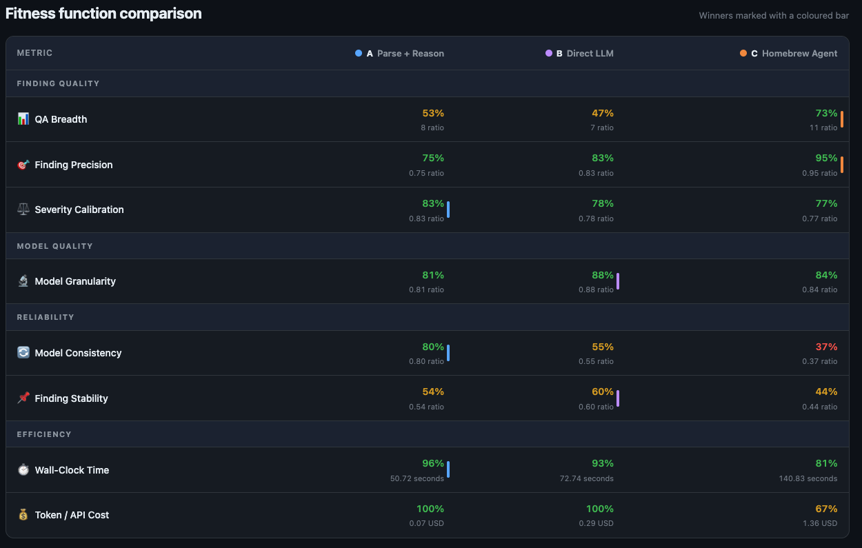 First, I defined fitness functions. These encode my architectural judgment about what “good” means for this specific system. One example: the tool sends a text summary of the codebase to an LLM, so I defined a token cost fitness function. It measures the token count of the generated summary and fails if it exceeds 12,000 tokens. That threshold encodes a judgment: the summary must fit in a single LLM context window with room for the analysis prompt. Other fitness functions cover findings quality, schema conformance, and parser coverage.